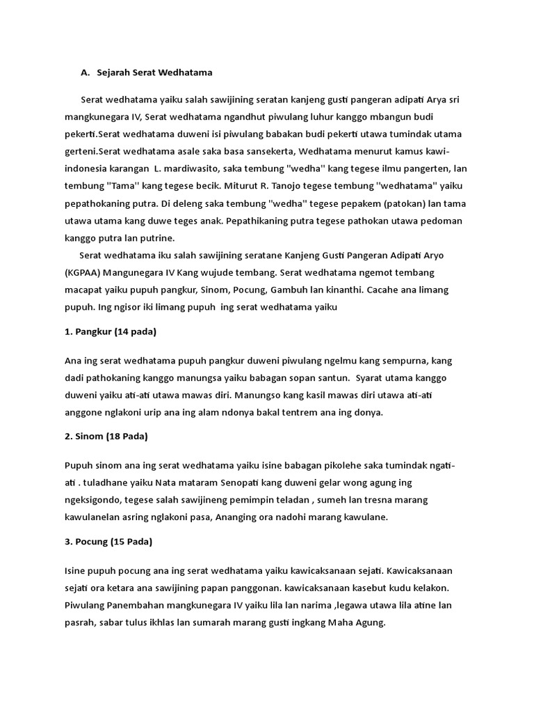 Bu guru ndamel buku saking kantor c. Bu guru ngasta buku saking. Piwulang kang ana sajroning tembang kasebut yaiku. Yaiku, sadurunge sampeyan perang ing sofitami. Di deleng saka tembung ''wedha'' tegese pepakem (patokan) lan tama utawa utama kang duwe teges anak. Aja dadi wong kang ala, aja ngomong saru, sregep ndungo, marang tiyang sepuhe kudu becik lan dadi wong kang guna. Contoh tembang dhandanggula buatan sendiri 6. Piwulang becik tembang kasebut yaiku dadi murid iku kudu bekti, sinau seng rajin, nduweni sikap kan jujur, luhur, lan rajin. Piwulang luhur kang diwarisi saka para leluhur ora genti diwarisake marang trah para penyambung. Tembung liyane latihan yaiku… 8. Tembung sindhi, tegese pasemon, indonesiane sindiran. Isine piwulang marang para mudha supaya ngucap lan tumindak becik tembung wedhatama ditegesi ilmu kang utama, sengaja kaanggit wujud tembang, amrih gampang diapalake. Tanojo tegese tembung ''wedhatama'' yaiku pepathokaning putra.