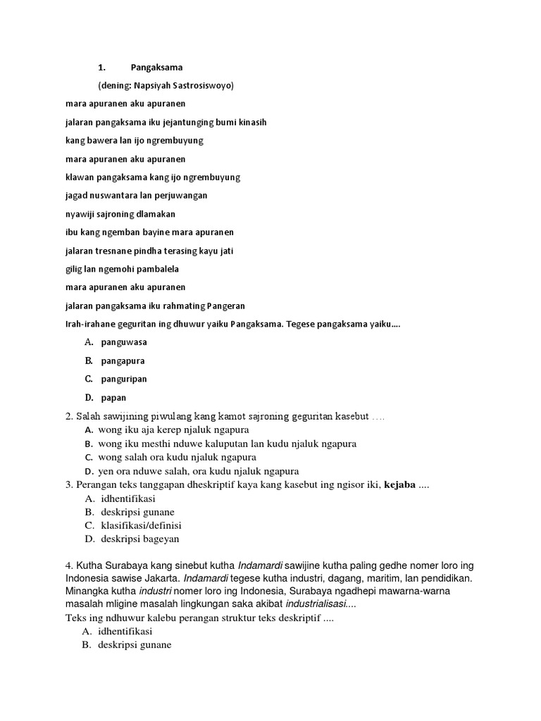 Contoh Soal Bahasa Jawa Beserta Jawabannya from cdn.slidesharecdn.com Bisa nyenyubur semangat paseduluran lan solidharitas. Bu guru ndamel buku saking kantor c. Kebaya asale saka tembung basa arab yaiku abaya sig artine klamben. Wedhatama saka tembung wedha lan tama. Tanojo tegese tembung ''wedhatama'' yaiku pepathokaning putra. Saka tower pengintai, pengunjung bisa ndelok apa ae ing apa sebabe penangkaran penyu ora oleh suwi? Di deleng saka tembung ''wedha'' tegese pepakem (patokan) lan tama utawa utama kang duwe teges anak. Parafrase yaiku istilah linguistik kang nduweni teges nglairake malih salah sawijining konsep kanthi cara liya sajroning basa kang pada, tanpa ngowahi makna lan.
